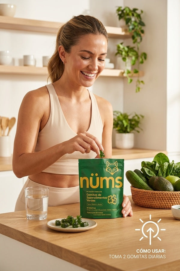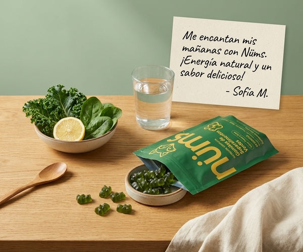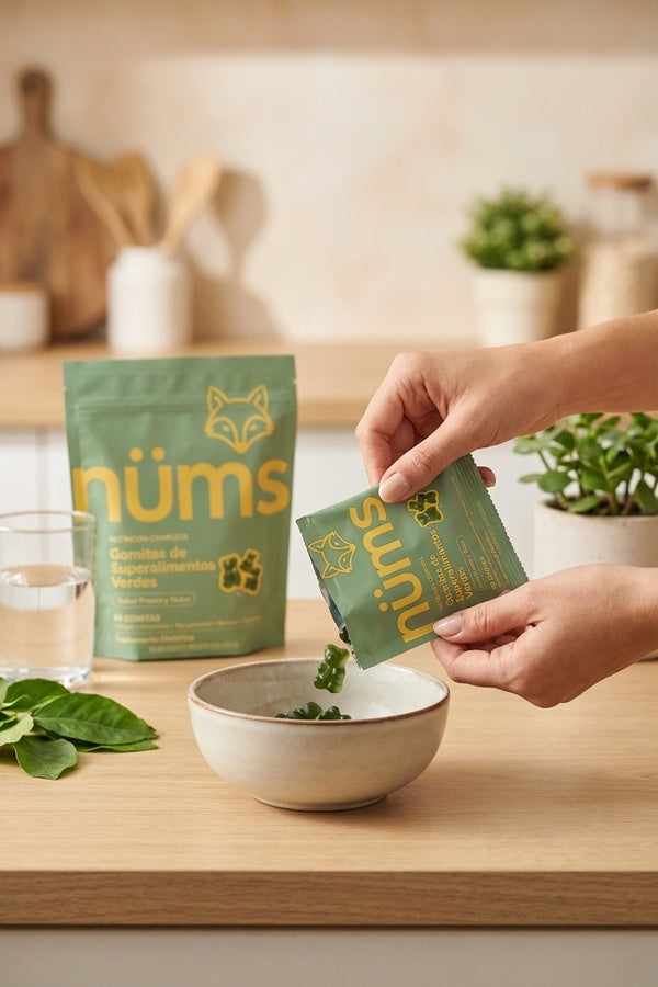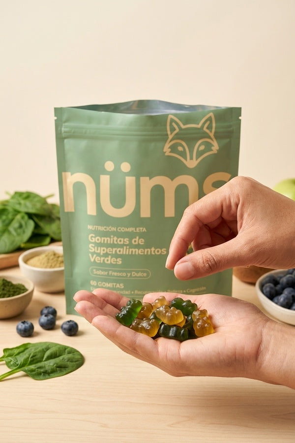 Creamos Nüms para llenar las brechas nutricionales con 60+ ingredientes potentes en un solo sobre de gomitas con sabor delicioso.